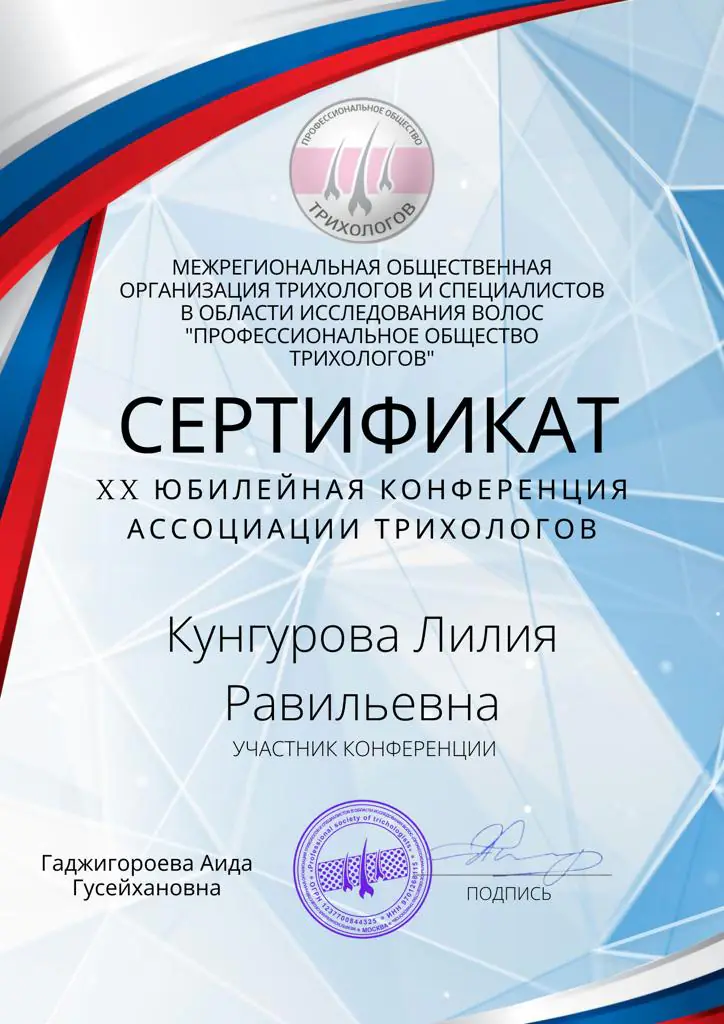- 2023 г. – «Трансплантация волос, современные методы и мировые стандарты (FUE/FUT)» авторский курс профессора А. Цилосани (эксперт по восстановлению волос мирового уровня, профессор Американской Академии Эстетической Медицины, преподаватель Всемирного FUE Института, член престижных научных сообществ (ISHRS, AAHRS).